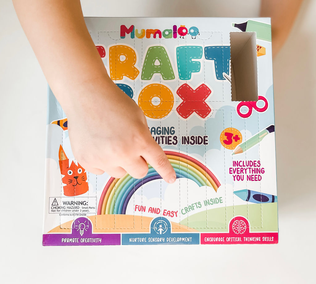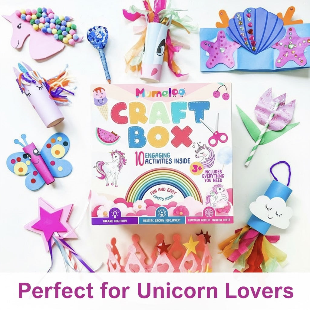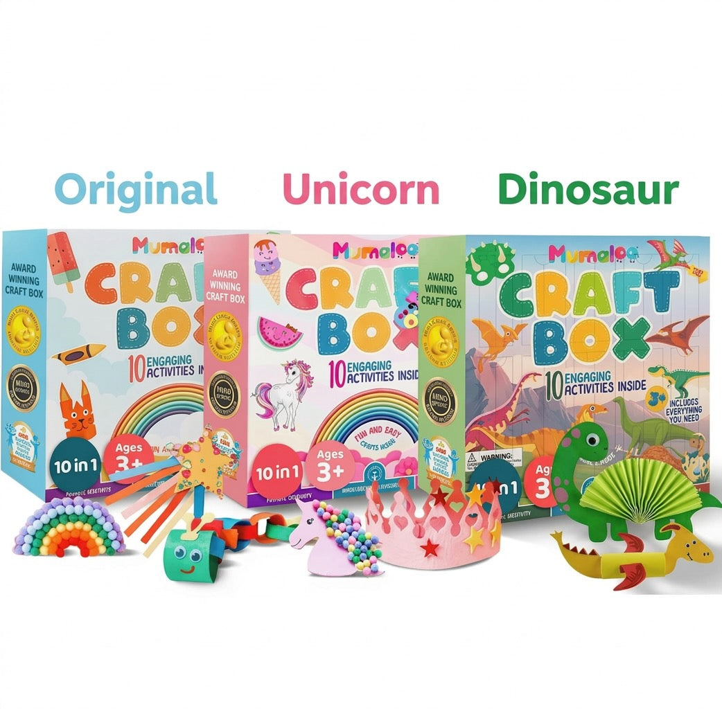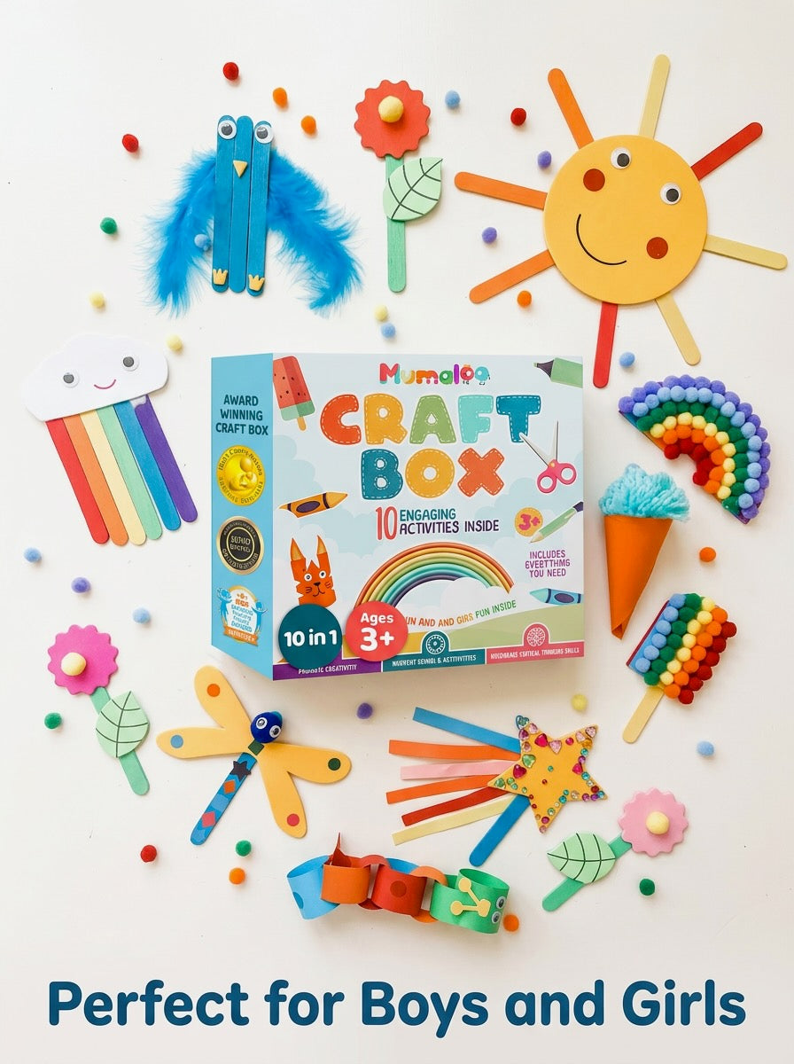 Mumaloo Surprise Craft Box includes 10 Pre-Packaged Craft activities with easy to follow step-by-step instructions and all the materials you need to complete each activity.
